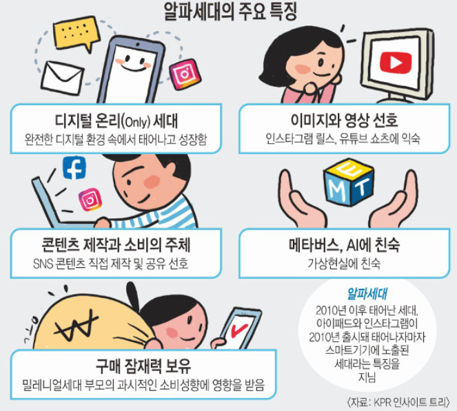 알파세대를 2010년 이후로 정의한 이유는 아이패드와 인스타그램이 보급된 게 2010년이기 때문입니다. Z세대가 스마트폰의 보급으로 나눠졌다면... 알파세대는 아이패드와 인스타죠 (어마어마한 파급력!!!)